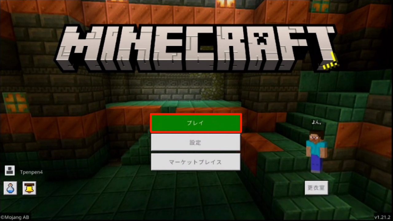 - 2緑色の「プレイ」ボタンから、マイクラを起動する